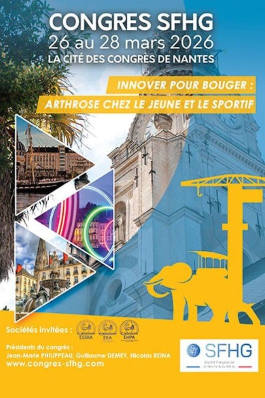 Chères consœurs, chers confrères, Après le succès des éditions de Lille et de Strasbourg, marquées par une participation toujours plus nombreuse et enthousiaste, nous avons le plaisir de vous convier à Nantes, ancienne capitale des Ducs de Bretagne, du 26 au 28 mars 2026, pour le prochain congrès annuel de la Société Française de la Hanche et du Genou (SFHG). Le congrès se déroulera à la Cité des Congrès de Nantes, en plein cœur de la ville, à deux pas du château des Ducs de Bretagne et des quais de la Loire. Cette situation privilégiée offrira aux participants un cadre à la fois historique, dynamique et convivial, reflétant l’attractivité d’une métropole moderne tournée vers l’avenir. Cet événement s’inscrit dans la continuité du rajeunissement et de l’ouverture de notre société, qui accueille depuis plusieurs années une nouvelle génération de membres dynamiques. Il illustre la vitalité de notre communauté et affirme plus que jamais l’ouverture internationale de la SFHG. Le programme scientifique mettra en lumière un thème d’actualité majeur : les pathologies dégénératives de la hanche et du genou chez le patient jeune et le sportif. Une problématique grandissante dans nos pratiques, avec des patients de plus en plus jeunes et exigeants, particulièrement attentifs aux résultats fonctionnels et sportifs de nos prises en charge chirurgicales. Comme lors des précédentes éditions, une belle place sera également laissée aux discussions interactives autour de dossiers cliniques, moments privilégiés d’échanges entre confrères et source d’enrichissement collectif. Nous aurons par ailleurs l’honneur d’accueillir des sociétés savantes de référence, ESSKA, EKA et EHPA, renforçant la dimension internationale de nos échanges. Pour favoriser cette ouverture, le congrès proposera une traduction simultanée en anglais ainsi que des sessions bilingues (français/anglais). Nous vous invitons d’ores et déjà à réserver vos dates et à nous rejoindre nombreux à Nantes, pour une édition 2026 qui s’annonce à la fois riche scientifiquement, interactive, ouverte sur l’international et marquée par la convivialité qui fait la force de la SFHG. Bien confraternellement, Le comité d’organisation :.